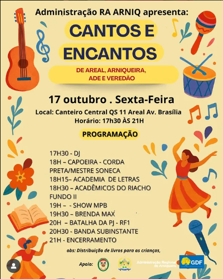 Para celebrar o 6º aniversário de Arniqueira, a Administração Regional promove nesta sexta-feira (17/10) o primeiro Sarau da Diversidade Cultural da cidade, um evento cultural que promete reunir diferentes manifestações artísticas sob o tema “Cantos e Encantos de Areal, Arniqueira, ADE e Veredão”.