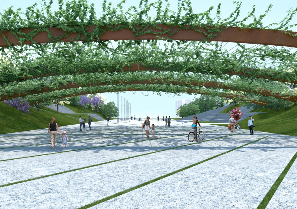 Outro elemento de destaque são quatro grandes arcos previstos no projeto, destinados a receber plantas trepadeiras, com a intenção de criar áreas de sombra, conforto térmico e uma paisagem visualmente marcante. Sidônio Porto comentou ser de grande importância ver o projeto do Parque Central de Águas Claras integrando a exposição “Um DF Possível” e também reconheceu ser fundamental o papel dos concursos públicos na construção de cidades mais qualificadas e inclusivas.