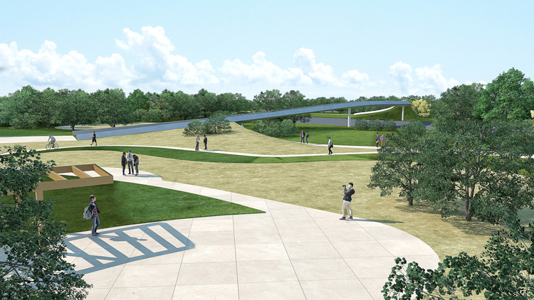 Esse eixo contará com pistas separadas para pedestres e ciclistas, interligadas a áreas de estar, além de passarelas sobre as linhas do metrô com desenho leve e marcante. O projeto também amplia calçadas com piso drenante e arborização, criando uma promenade de integração entre os parques e o entorno urbano.